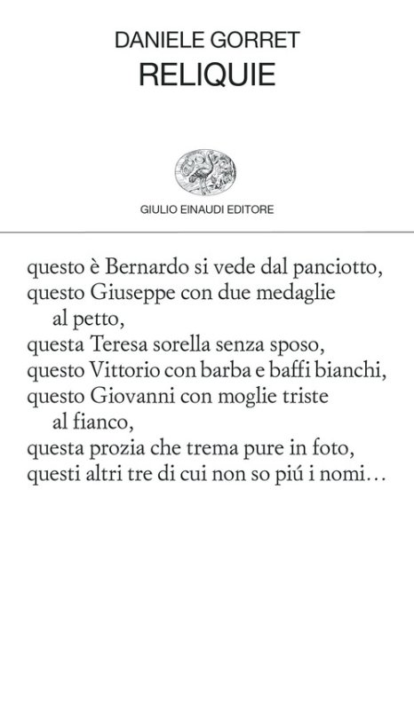 Questo di Daniele Gorret è un libro particolare, monotematico, tutto dedicato ai resti, a ciò che rimane per poco o per molto tempo: una pietra che resiste dal paleozoico, il cadavere di un passero che invece fra pochi giorni non ci sarà più, un vecchio quaderno di scuola, un disco dei nonni, i peli di un cane morto da anni che ogni tanto riemergono da un tappeto o da un cuscino dismesso... La reliquia è un concentrato di vita vissuta, di memoria, di dignità con cui viene attraversato il tempo. Ma è anche un oggetto, sempre in bilico tra il museo e la pattumiera. È un corpo, un corpo esposto e predisposto alla devozione. Così Gorret snoda questa raccolta di poesie come un rito atto a evocare l'essenza più profonda della vita e della morte.