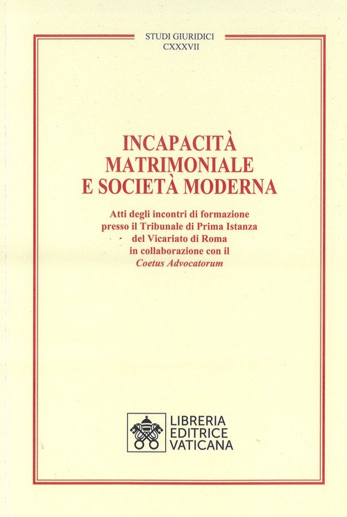 | Titolo | Incapacità matrimoniale e società moderna. Atti degli incontri di formazione presso il Tribunale di Prima Istanza del Vicariato di Roma in collaborazione con il Coetus Advicatorum |