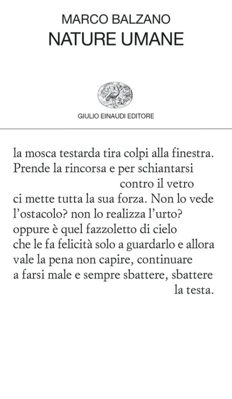 Altre esistenze, note a margine, mezze verità, testimonianze, particolari in controsenso: queste, e altre ancora, le immagini con cui Marco Balzano prova a classificare le poesie che lo accompagnano da molti anni (non tutti i suoi lettori sapranno che ha esordito appunto come poeta nel 2007) e che trovano ora, con quelle più recenti e inedite, una definitiva sistemazione nelle Nature umane che le raccolgono. Poesia che prova a scalfire la crosta dell'apparenza, come ha osservato Giampiero Neri; tensione gnomica che attraversa le parole, secondo il giudizio di Giancarlo Pontiggia; testi che indagano e custodiscono qualche scintilla di senso, di dubbio, di verità, e che si offrono al lettore come «le arance fasciate nella paglia», capaci di illuminare antichi e nuovi inverni. La scrittura poetica nasce qui dal dettaglio concreto, materico: l'oggetto improvvisamente colto dallo sguardo è interrogato dalla mente e dalla coscienza, e manifestato nel «rosario più scheggiato», quello delle parole, trasformandosi in un breve dispositivo ritmico che ne potenzia e moltiplica i significati, spiazza le aspettative, turba. La parola poetica, annotava Balzano in Le parole sono importanti (2019), «crea l'interpretazione»: si offre al lettore e lo impegna a non essere soltanto «animale senz'anima, nient'altro che vivente». Gli chiede di camminare «sotto il dirupo», ricordando (con profumo dantesco) che «in questa vigilia eterna la borraccia è la sola cosa che va tenuta stretta» (Fabio Pusterla).