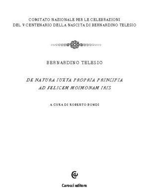 Il Comitato nazionale per le celebrazioni del V centenario della nascita di Bernardino Telesio ha promosso la pubblicazione in ristampa anastatica di tutte le opere del filosofo cosentino (1509-1588), oggi difficilmente reperibili. Sono previsti cinque volumi. In questo volume iniziale della serie si pubblicano due testi di straordinaria importanza: il "De natura iuxta propria principia" (Antonio Biado, Roma 1565) - considerato da Eugenio Garin come il capolavoro di Telesio rispetto alle due successive edizioni (1570 e 1586) - che reca non soltanto numerosissime aggiunte, correzioni e osservazioni, ma anche il rifacimento di interi capitoli; e l'esemplare di un'edizione sconosciuta agli studiosi dell'opuscolo De iride, apparso a Napoli presso Mattia Cancer nel 1566 col titolo "Ad Felicem Moimonam iris". La ristampa è arricchita da un'ampia introduzione di Roberto Bondì che ha anche curato un prezioso indice analitico in cui sono presenti le parole chiave del lessico telesiano. Premessa di Nuccio Ordine.